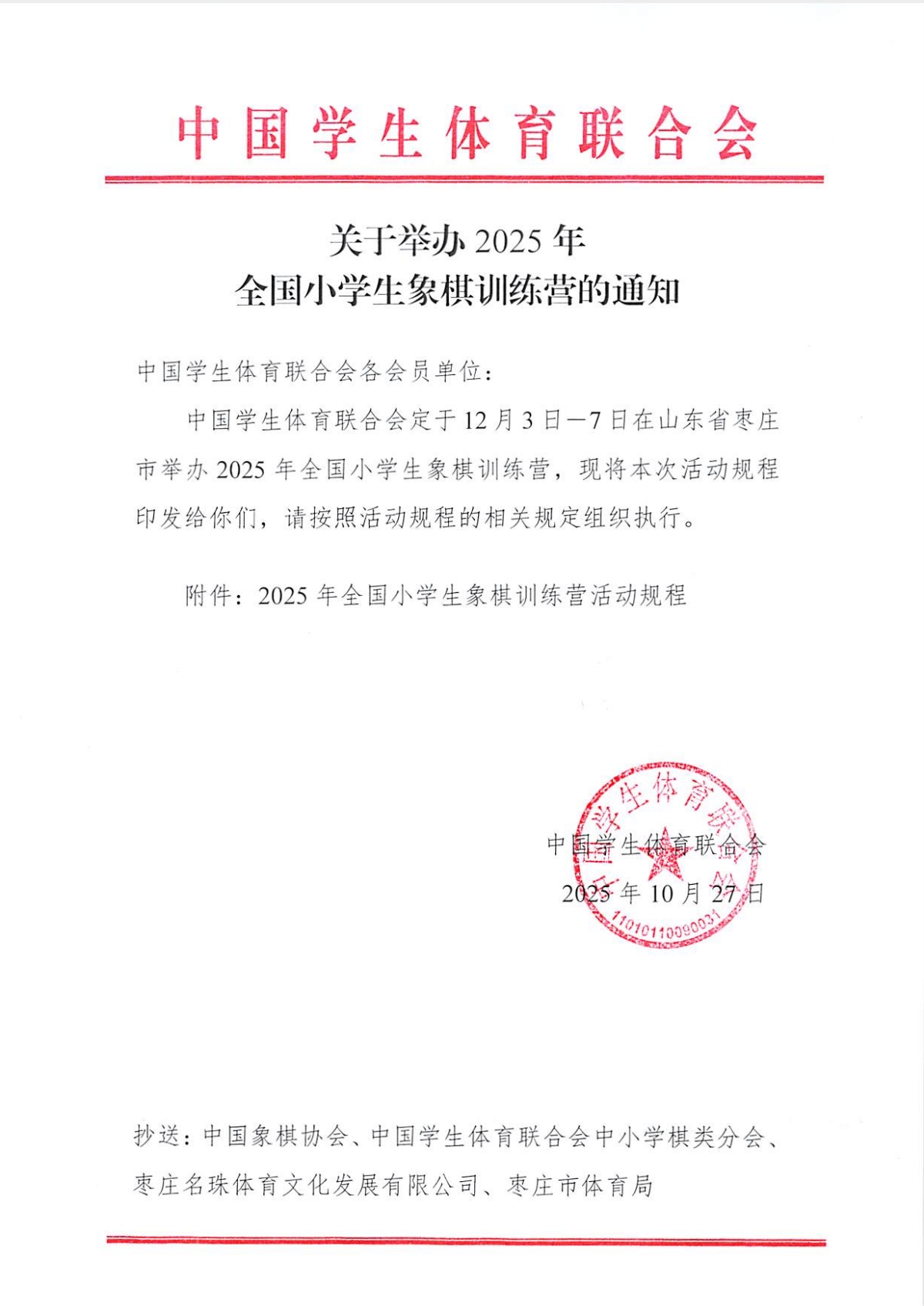 关于举办2025年全国小学生象棋训练营的通知