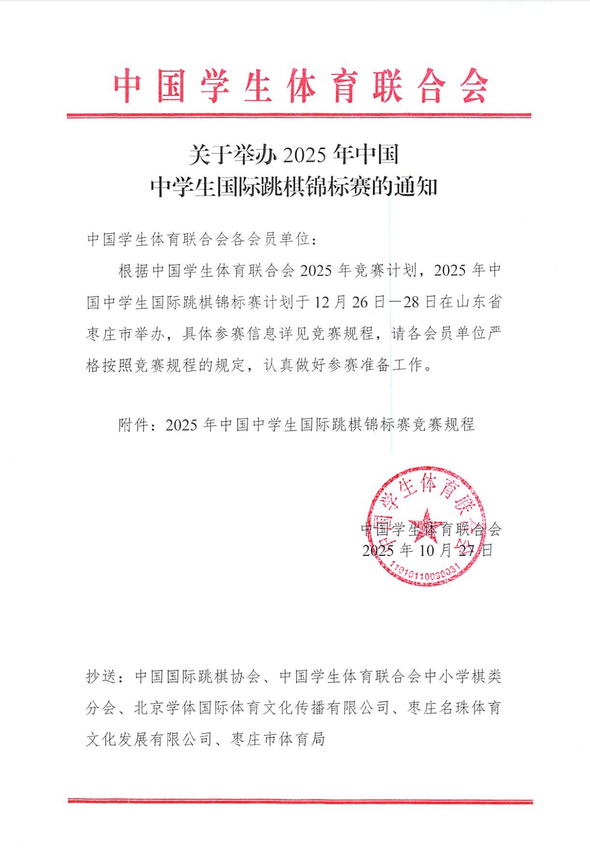 关于举办2025年中国中学生国际跳棋锦标赛的通知