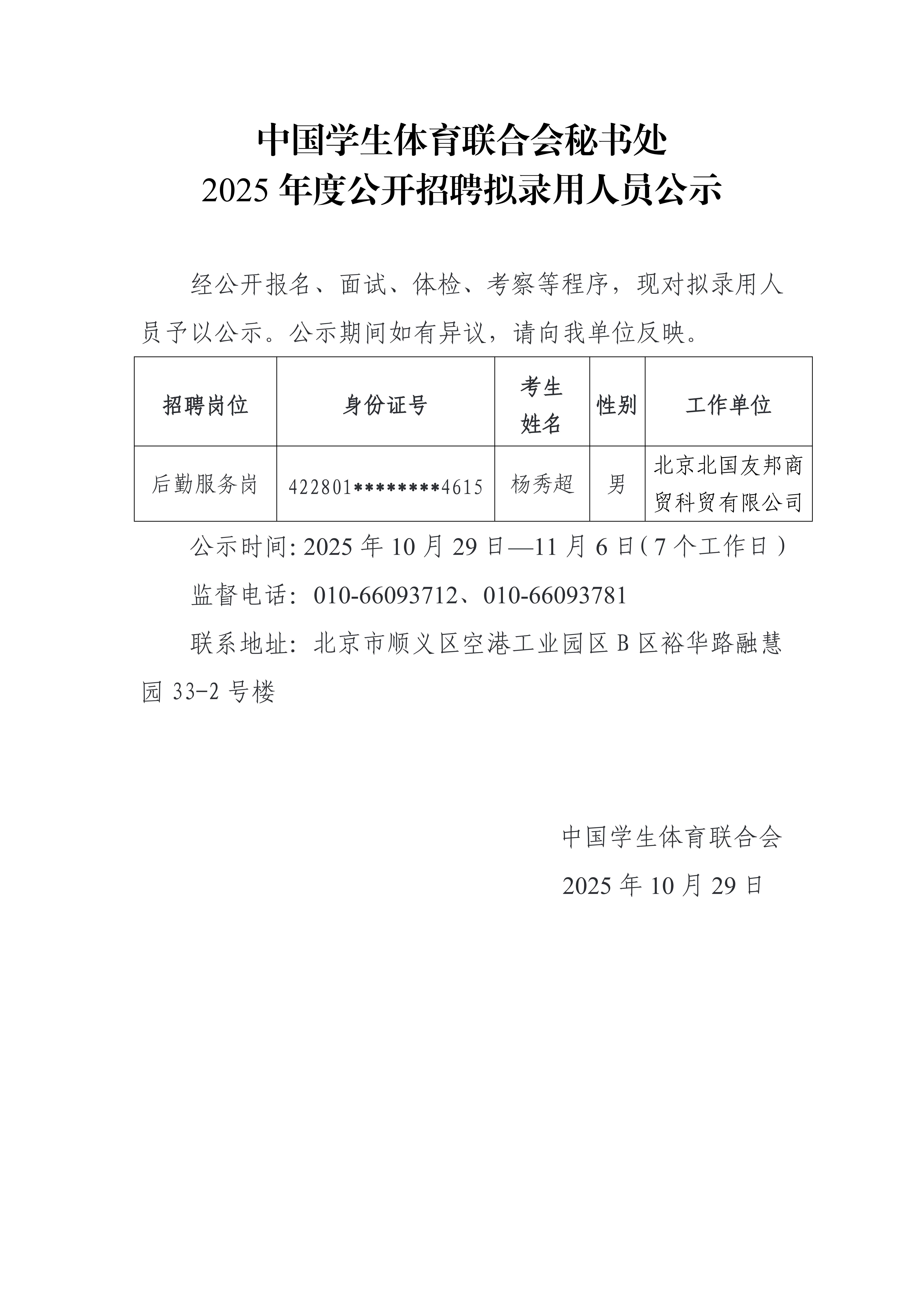 中国学生体育联合会秘书处2025年度公开招聘拟录用人员公示
