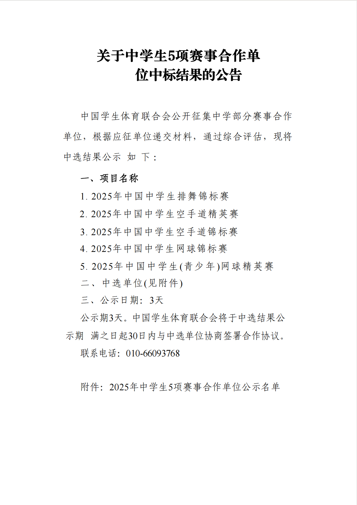 关于中学生5项赛事合作单位中标结果的公告
